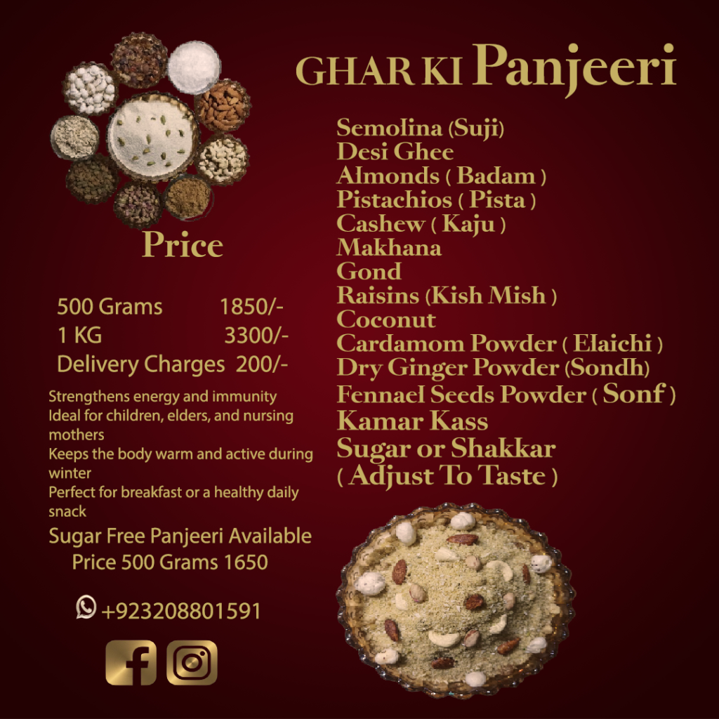 Freshly prepared with care, our 100% homemade Panjeeri is a wholesome blend of fine semolina (Suji), pure desi ghee, and premium dry fruits.👏